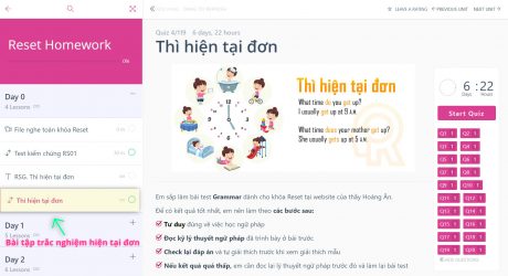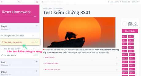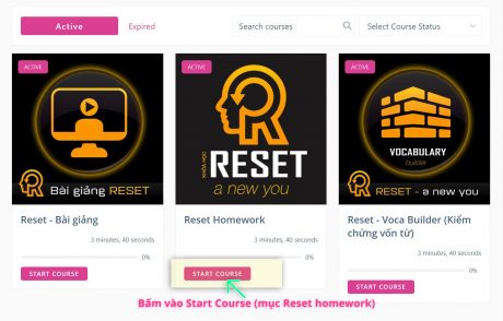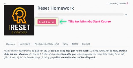 Ba thành phần đó là Reset – bài giảng, Reset – Voca BuilderReset Homework. Em sẽ bấm vào nút Start Course của Reset Homework. Các thành phần còn lại thầy sẽ hướng dẫn thêm khi nhập học.