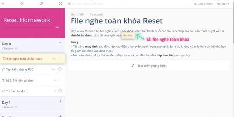 3/ Khi bấm đúng hướng dẫn, em sẽ thấy một danh sách bài tập được phân theo ngày. Trước buổi khai giảng được xem là Day 0. Các em bấm vào mục “File nghe toàn khóa Reset” và nhấn vào link tải để download file nghe giáo trình.