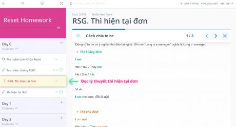 5/ Đọc lý thuyết ngữ pháp: tiếp đến em bấm vào RSG. Thì hiện tại đơn và đọc lý thuyết.